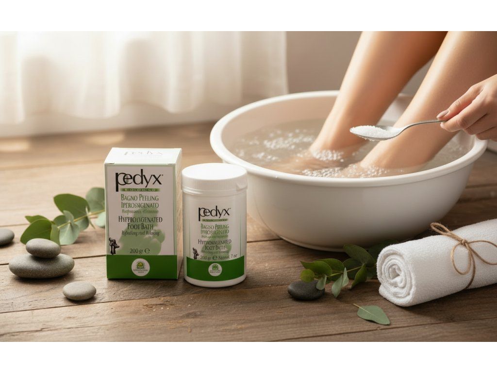 POUŽITÍ: Ponořte nohy do teplé vody (37°C), přidejte víčko (15 g) prášku a dopřejte si 5-10 minutovou relaxační koupel nohou. Potom chodidla osušte a natřete PEDYX krémem na nohy podle typu pokožky nebo PEDYX emulzí.